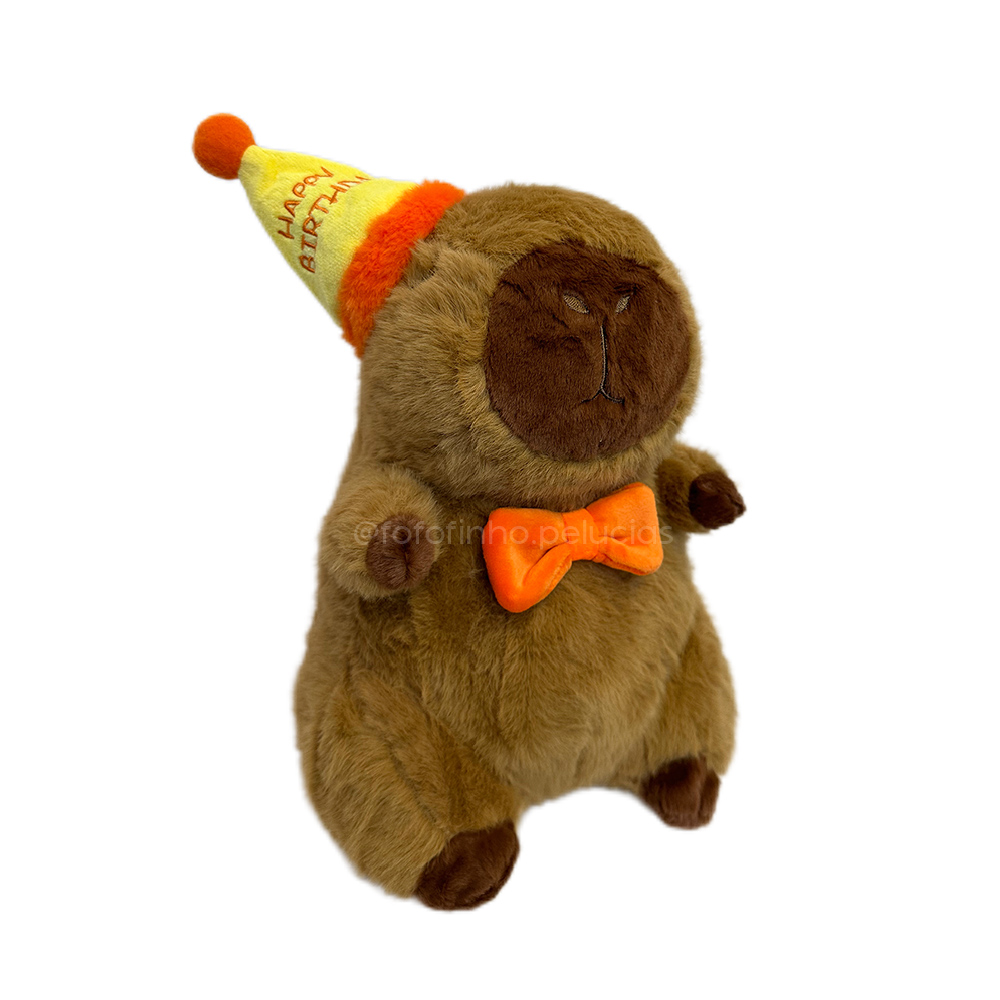 Capivara de Pelúcia Médio Com Chapéu Happy Birthday, atóxico, ideal para presentear crianças e adultos.