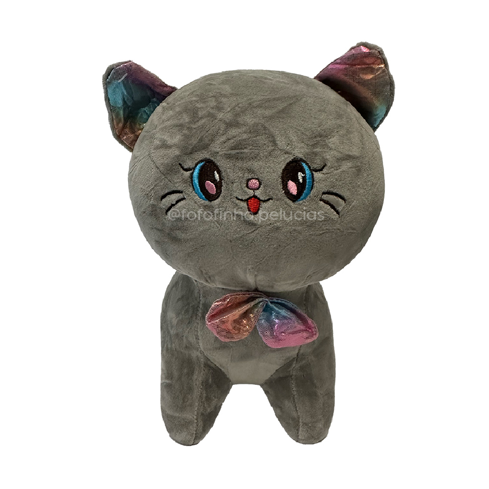 Gato de pelúcia, possue um toque macio, atóxico. Tamanho médio na cor cinza. Ideal para máquina de bichinhos, máquina grua, e para presentear crianças de 2 a 10 anos.